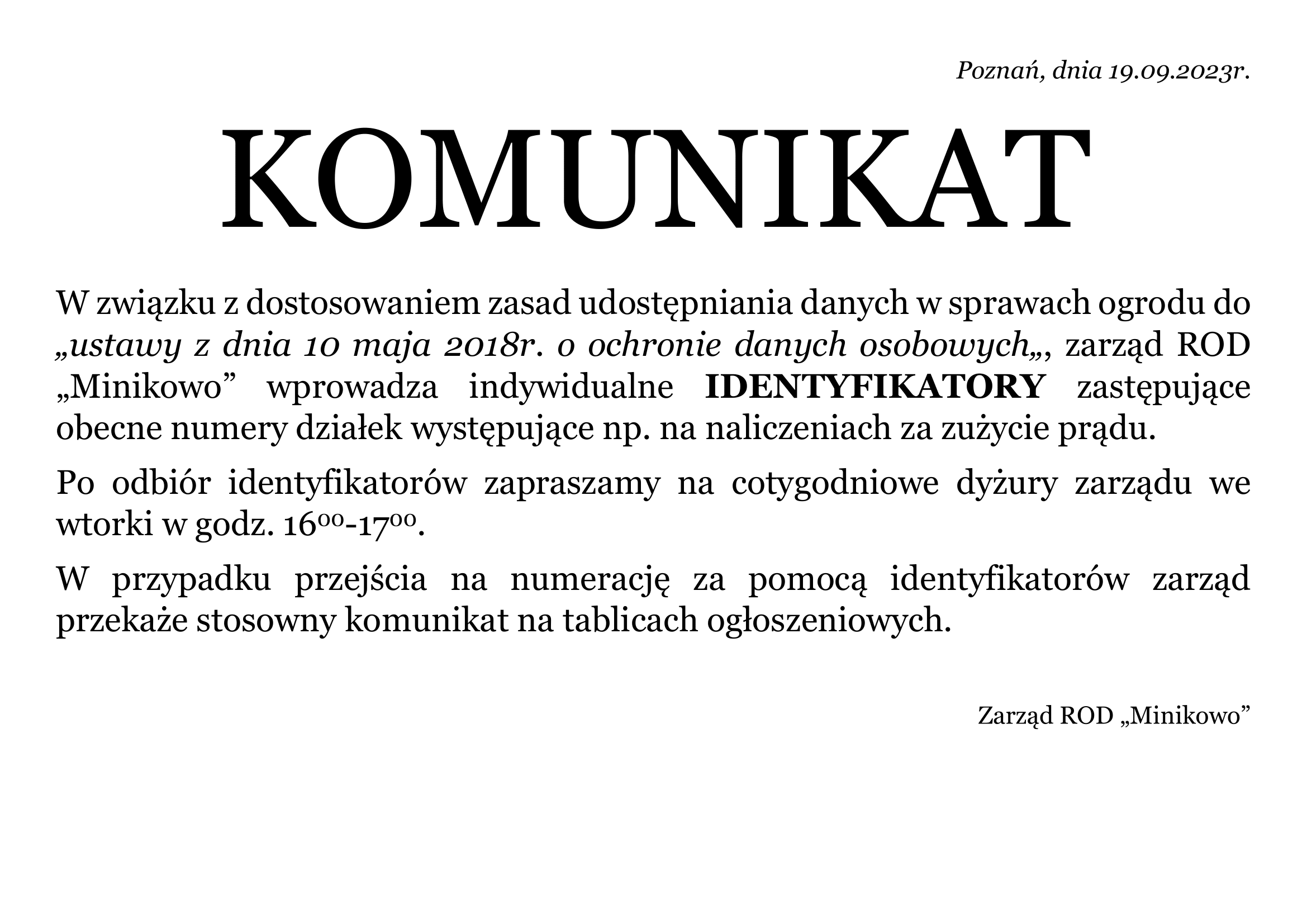W związku z dostosowaniem zasad udostępniania danych w sprawach ogrodu do „ustawy z dnia 10 maja 2018r. o ochronie danych osobowych„, zarząd ROD „Minikowo” wprowadza indywidualne IDENTYFIKATORY zastępujące obecne numery działek występujące np. na naliczeniach za zużycie prądu.
