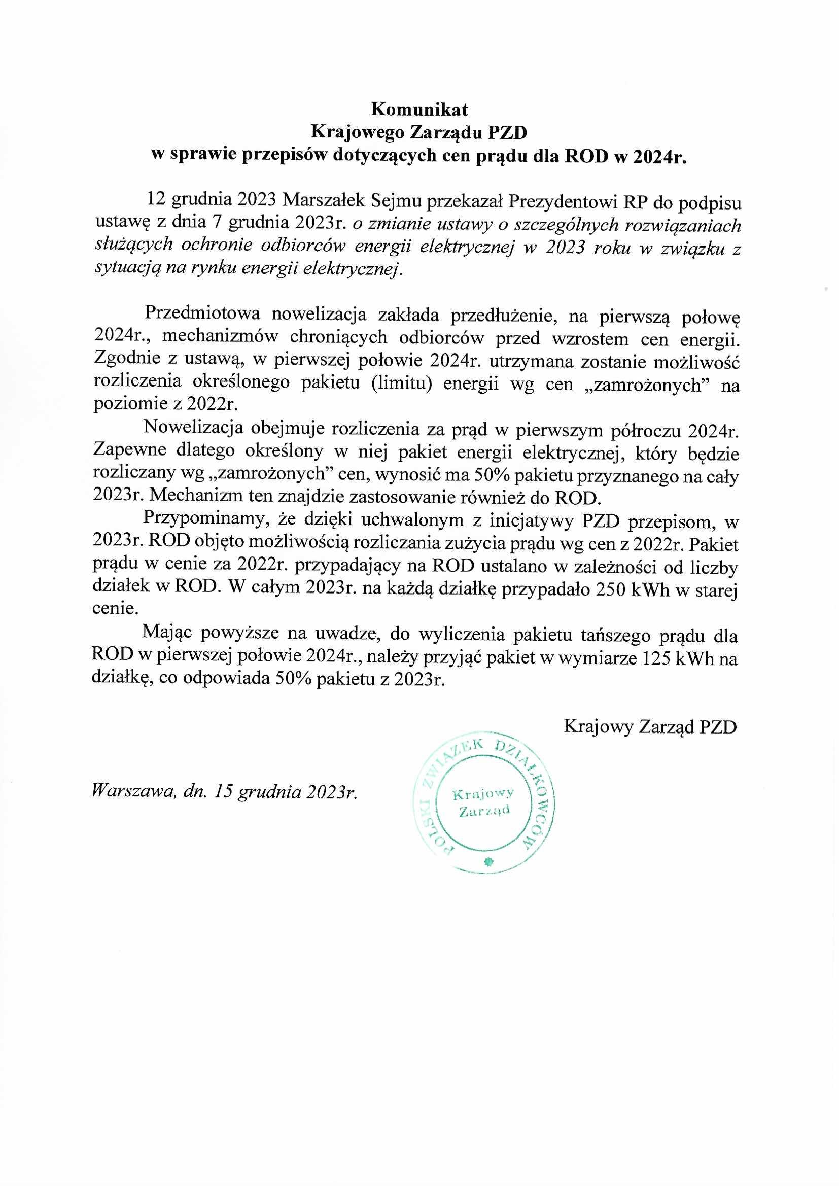 Przekazujemy Państwu komunikat Krajowego Zarządu PZD dotyczący zamrożenia cen prądu w 2024r., w którym według nowelizacji ustawy każda działka ROD rozliczana byłaby w ilości do zużycia 125 kWh w cenie 0,75 zł. w przyszłym roku 2024, reszta po cenie aktualnej czyli 1,23 zł. Jest to bardzo dobra informacja dla naszej społeczności. Rozliczenia za zużytą energię w nowym roku dostosujemy do powyższej nowelizacji.