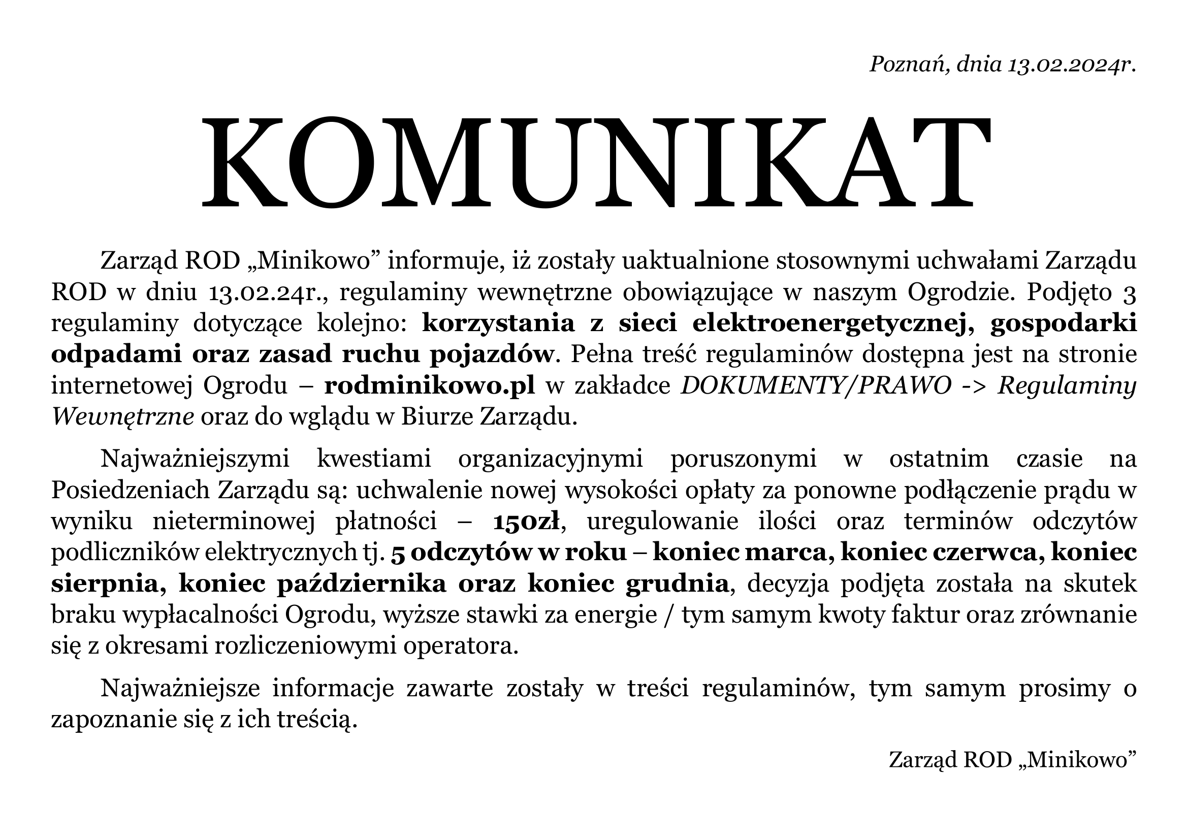 Zarząd ROD „Minikowo” informuje, iż zostały uaktualnione stosownymi uchwałami Zarządu ROD w dniu 13.02.24r., regulaminy wewnętrzne obowiązujące w naszym Ogrodzie. Podjęto 3 regulaminy dotyczące kolejno: korzystania z sieci elektroenergetycznej, gospodarki odpadami oraz zasad ruchu pojazdów. Pełna treść regulaminów dostępna jest na stronie internetowej Ogrodu – rodminikowo.pl w zakładce DOKUMENTY/PRAWO -> Regulaminy Wewnętrzne oraz do wglądu w Biurze Zarządu.