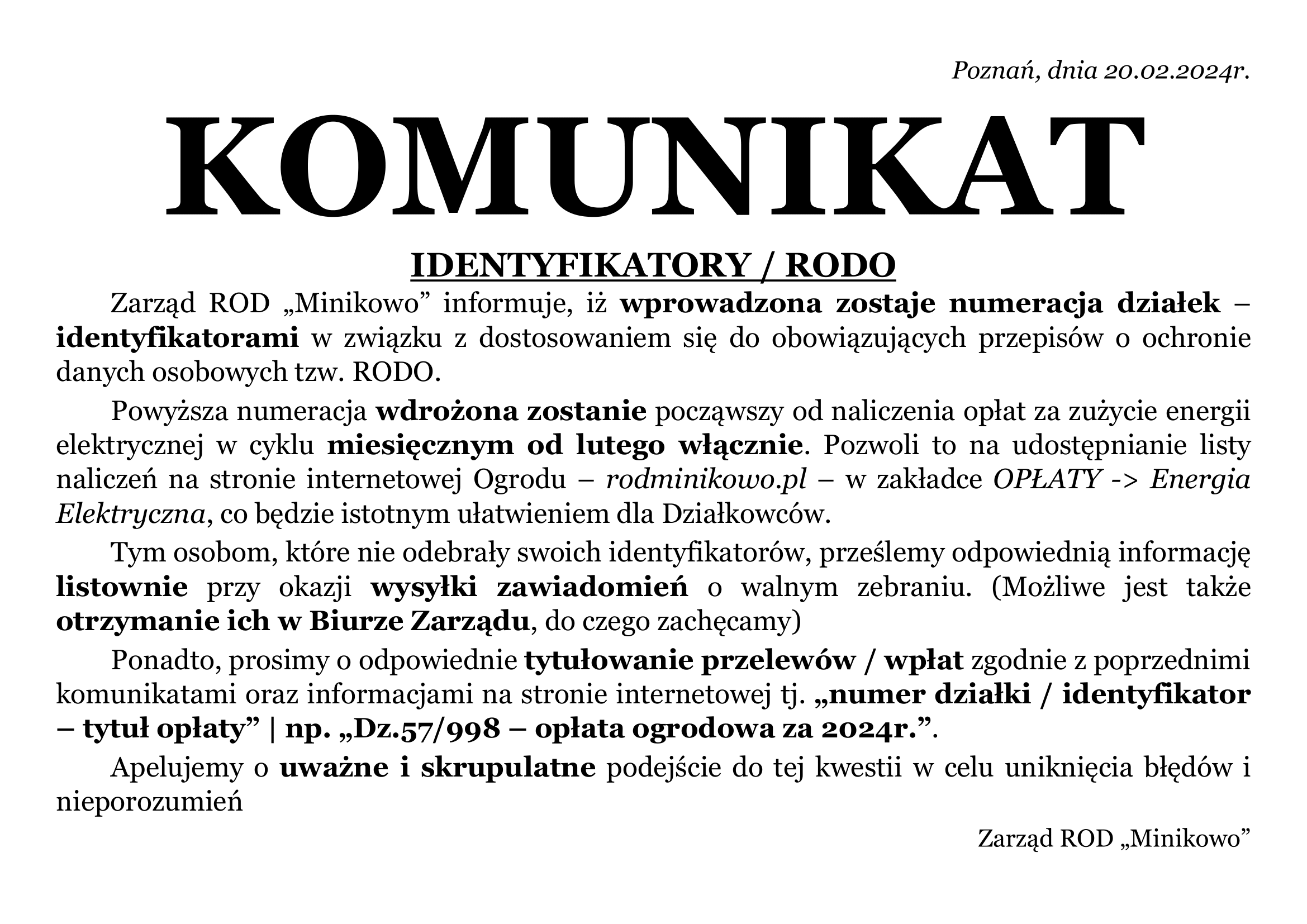 Zarząd ROD „Minikowo” informuje, iż wprowadzona zostaje numeracja działek – identyfikatorami w związku z dostosowaniem się do obowiązujących przepisów o ochronie danych osobowych tzw. RODO.