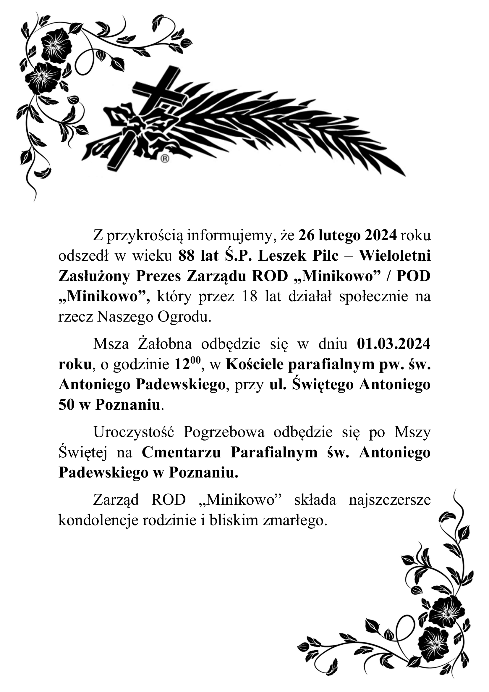 Zarząd ROD „Minikowo” składa najszczersze kondolencje rodzinie i bliskim zmarłego.