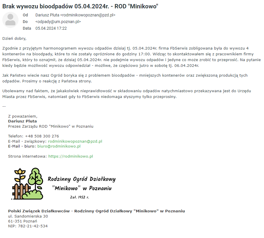 Jak Państwo wiecie nasz Ogród boryka się z problemem bioodpadów – mniejszych kontenerów oraz zwiększoną produkcją tych odpadów. Prosimy o reakcję z Państwa strony.