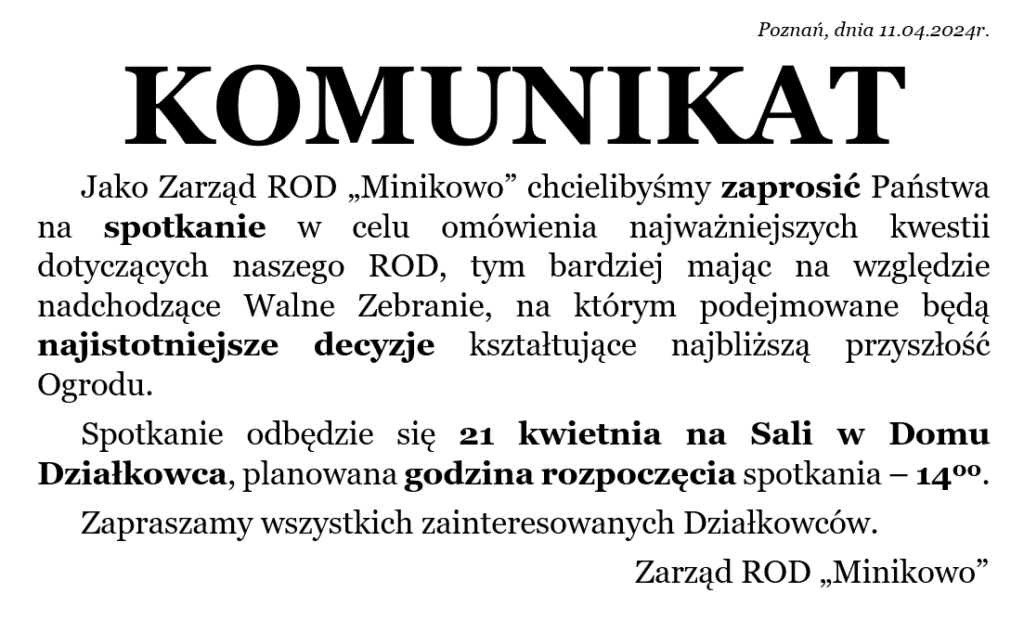 Jako Zarząd ROD „Minikowo” chcielibyśmy zaprosić Państwa na spotkanie w celu omówienia najważniejszych kwestii dotyczących naszego ROD, tym bardziej mając na względzie nadchodzące Walne Zebranie, na którym podejmowane będą najistotniejsze decyzje kształtujące najbliższą przyszłość Ogrodu.