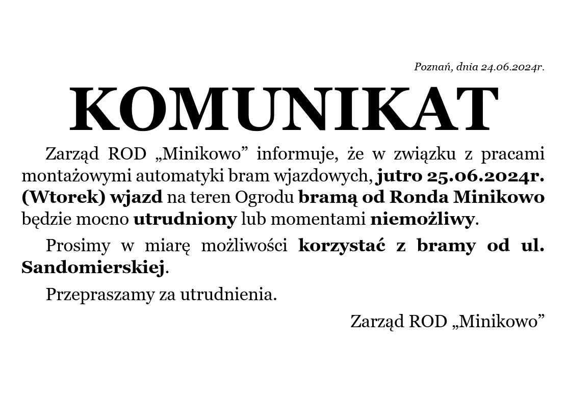 Zarząd ROD „Minikowo” informuje, że w związku z pracami montażowymi automatyki bram wjazdowych, jutro 25.06.2024r. (Wtorek) wjazd na teren Ogrodu bramą od Ronda Minikowo będzie mocno utrudniony lub momentami niemożliwy.