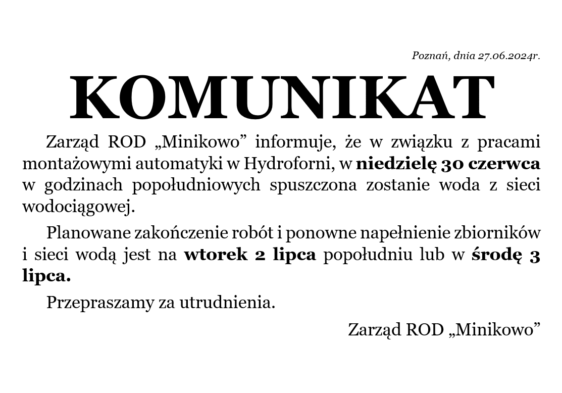 Zarząd ROD „Minikowo” informuje, że w związku z pracami montażowymi automatyki w Hydroforni, w niedzielę 30 czerwca w godzinach popołudniowych spuszczona zostanie woda z sieci wodociągowej.