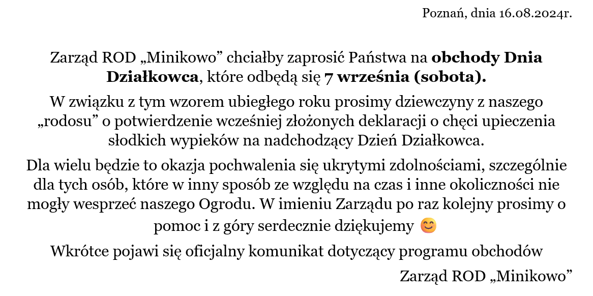 Zarząd ROD „Minikowo” chciałby zaprosić Państwa na obchody Dnia Działkowca, które odbędą się 7 września (sobota).
