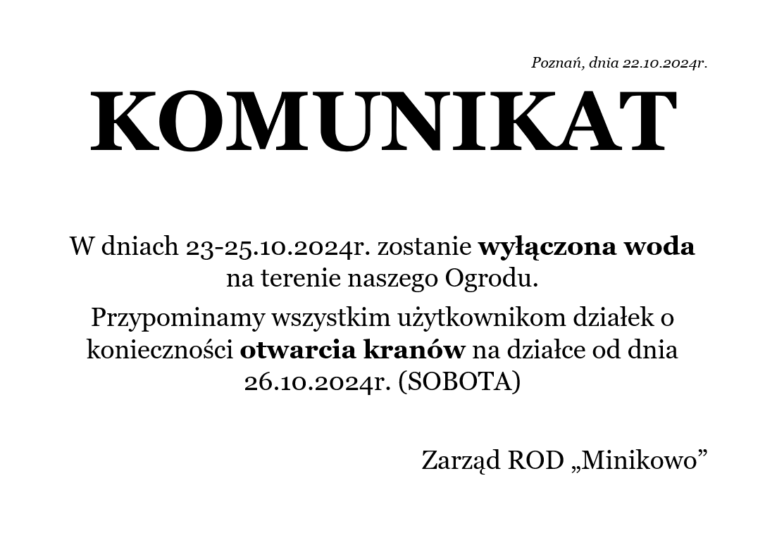 Przypominamy wszystkim użytkownikom działek o konieczności otwarcia kranów na działce od dnia 26.10.2024r. (SOBOTA)