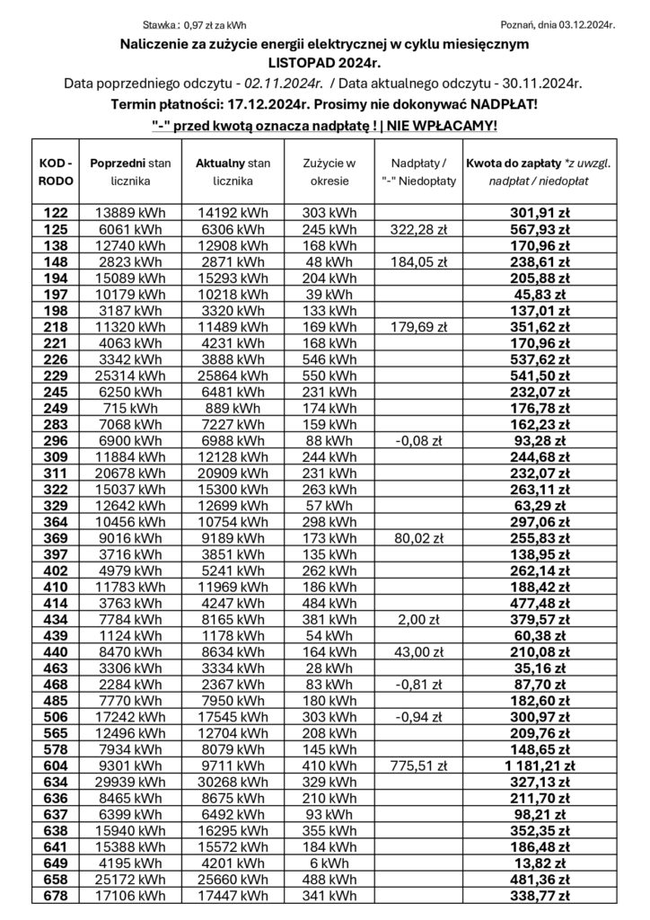 Rozliczono zużycie energii elektrycznej za listopad 2024r. w cyklu miesięcznym. Poniżej link do naliczenia.