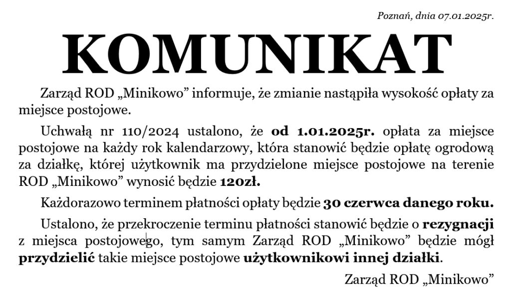 Uchwałą nr 110/2024 ustalono, że od 1.01.2025r. opłata za miejsce postojowe na każdy rok kalendarzowy, która stanowić będzie opłatę ogrodową za działkę, której użytkownik ma przydzielone miejsce postojowe na terenie ROD „Minikowo” wynosić będzie 120zł.