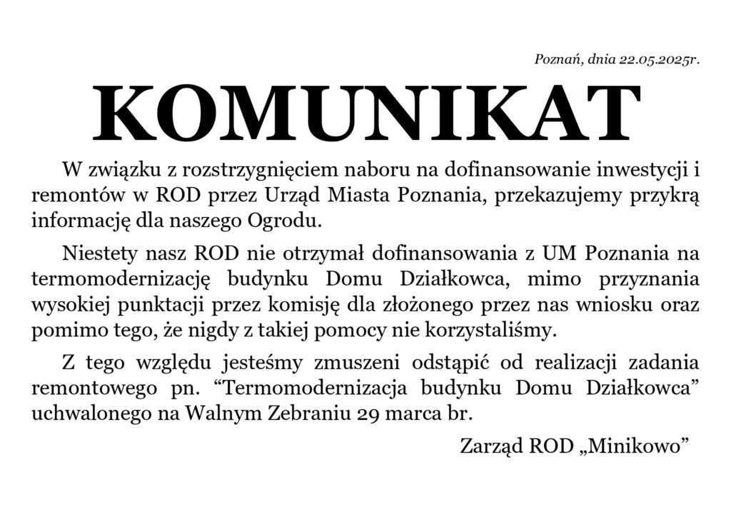 W związku z rozstrzygnięciem naboru na dofinansowanie inwestycji i remontów w ROD przez Urząd Miasta Poznania, przekazujemy przykrą informację dla naszego Ogrodu.