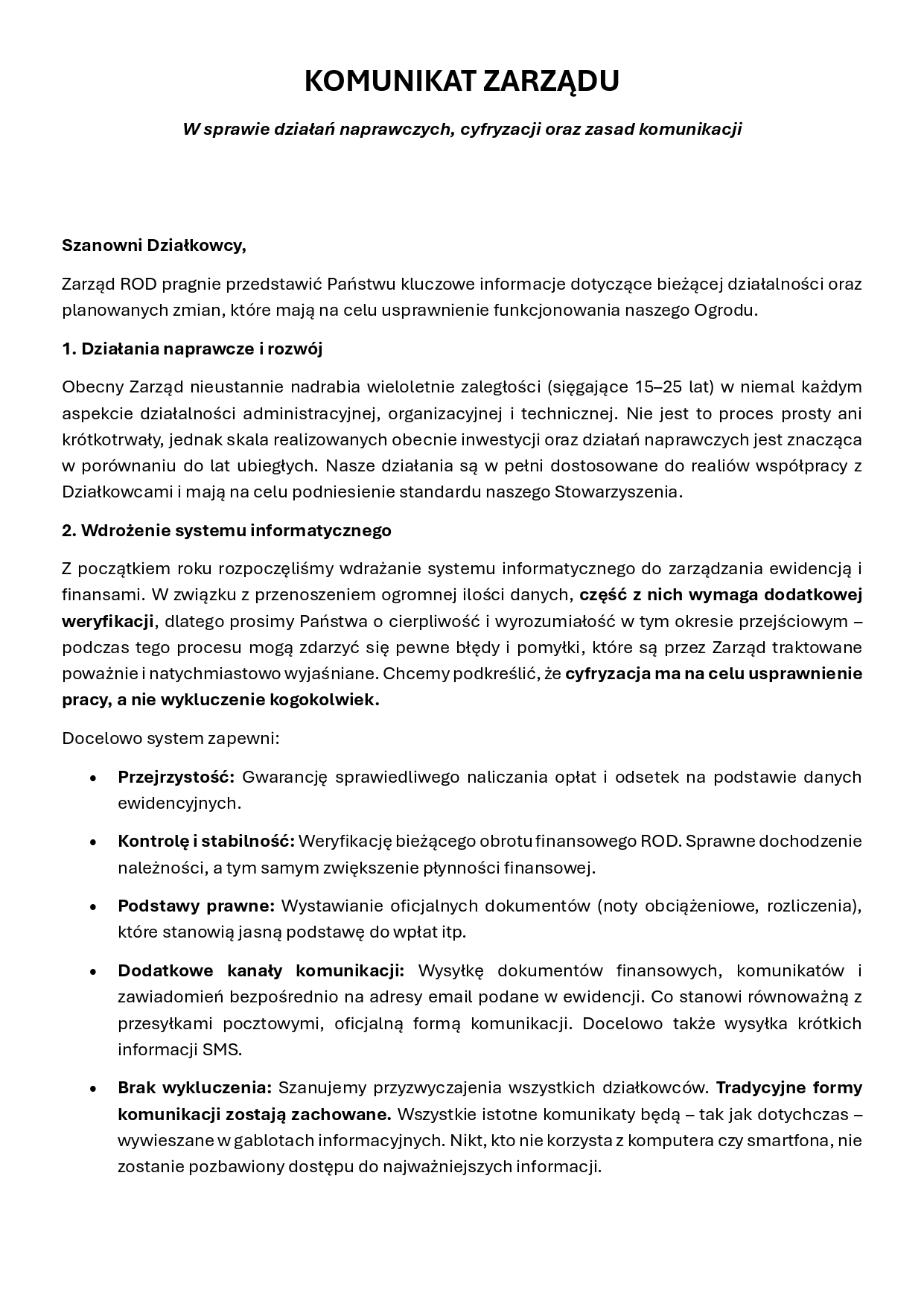 Zarząd ROD pragnie przedstawić Państwu kluczowe informacje dotyczące bieżącej działalności oraz planowanych zmian, które mają na celu usprawnienie funkcjonowania naszego Ogrodu.