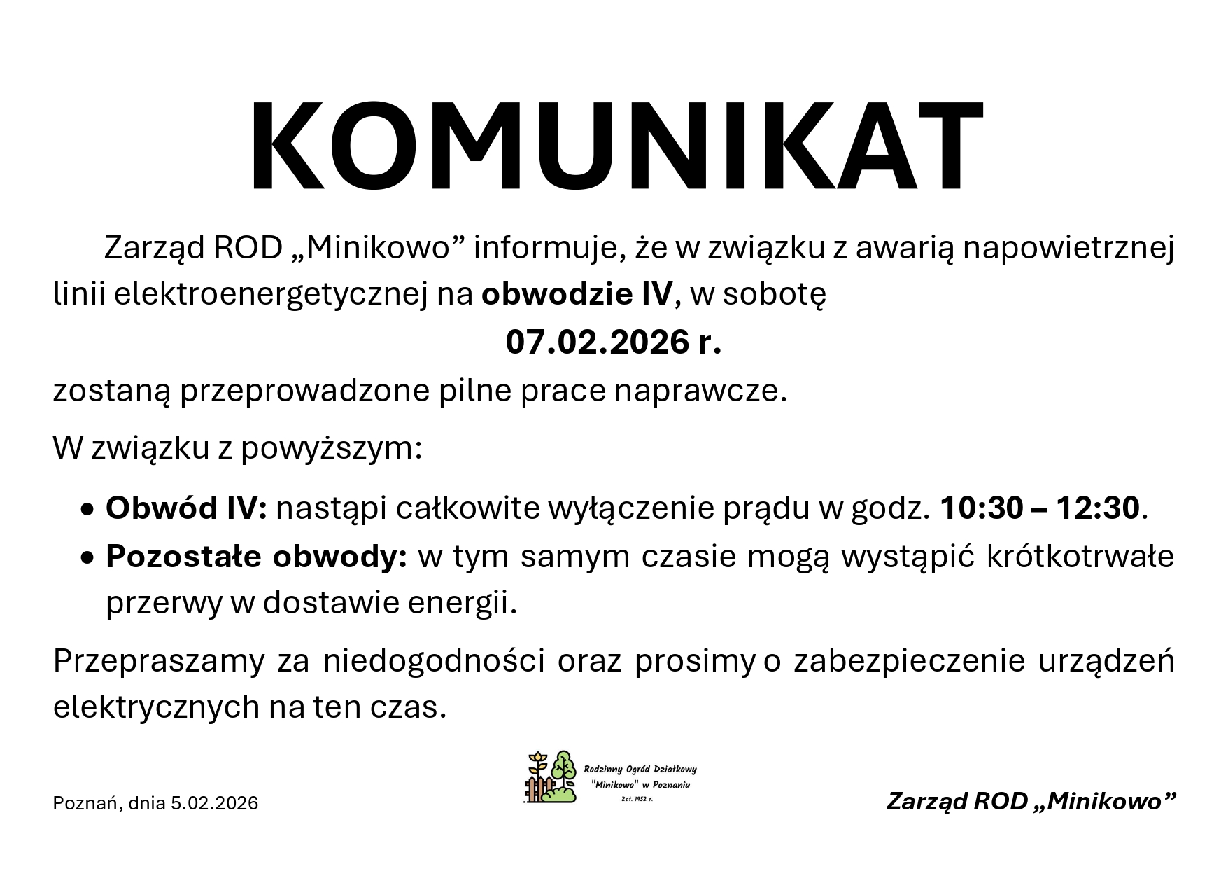Zarząd ROD „Minikowo” informuje, że w związku z awarią napowietrznej linii elektroenergetycznej na obwodzie IV, w sobotę