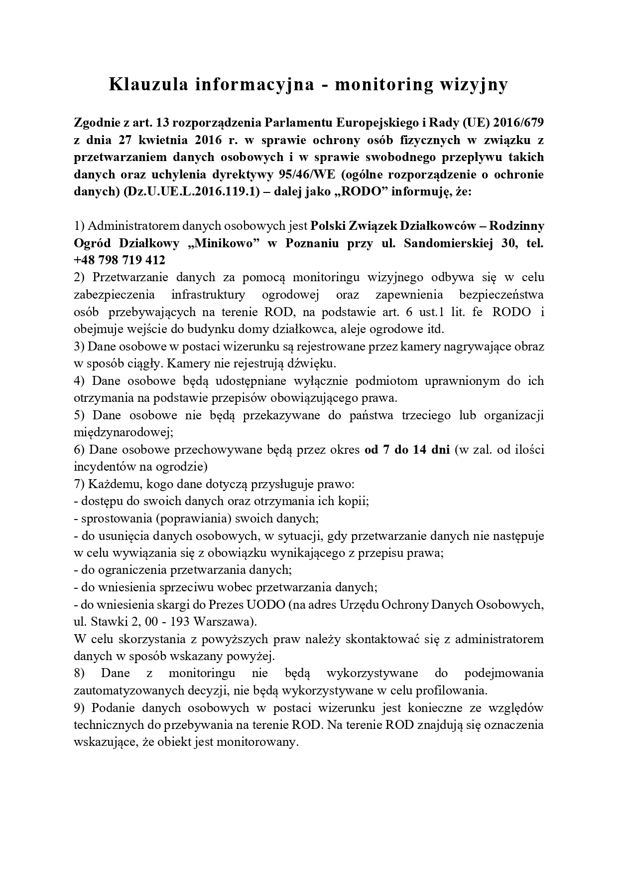 Klauzula informacyjna – monitoring wizyjny na terenie ROD Minikowo
